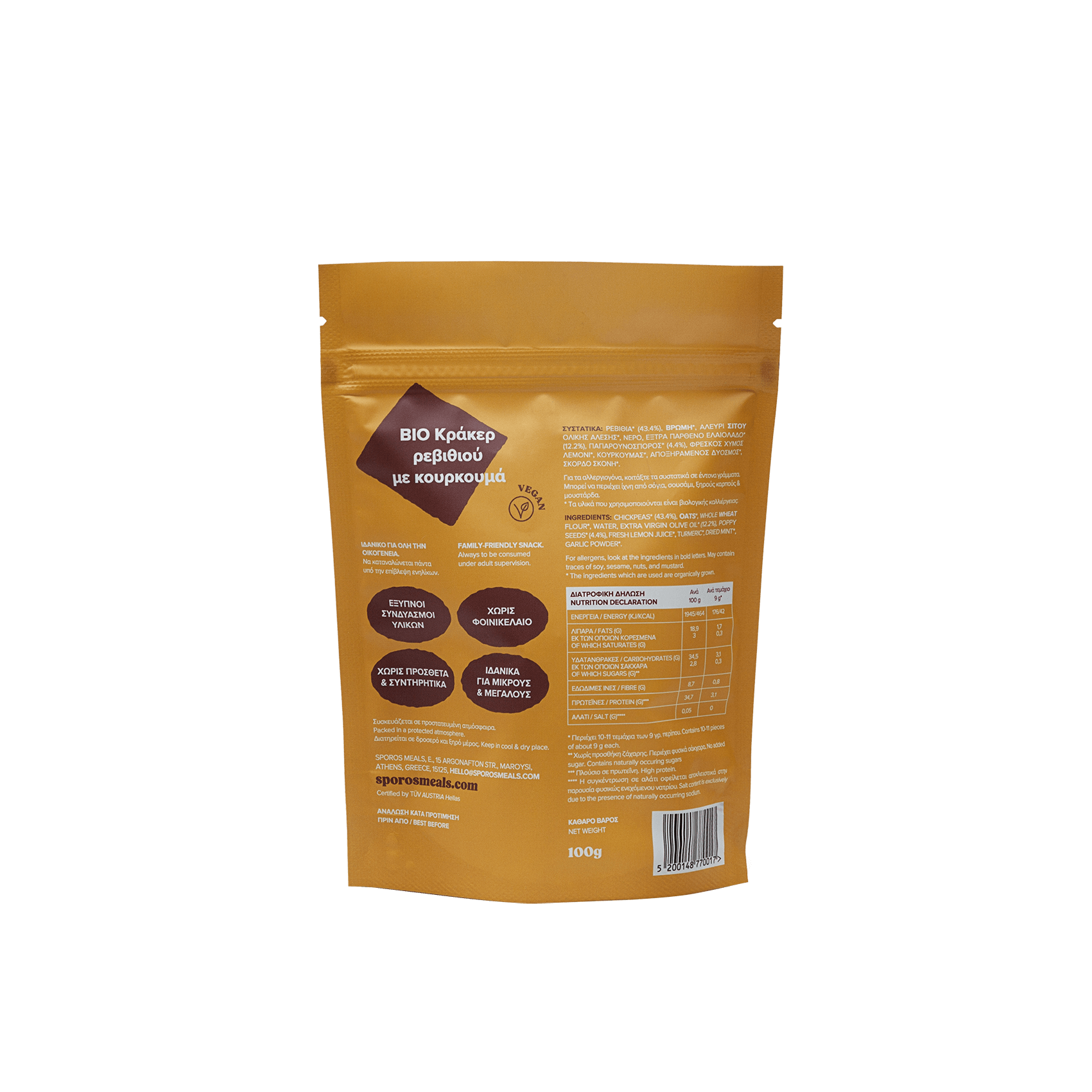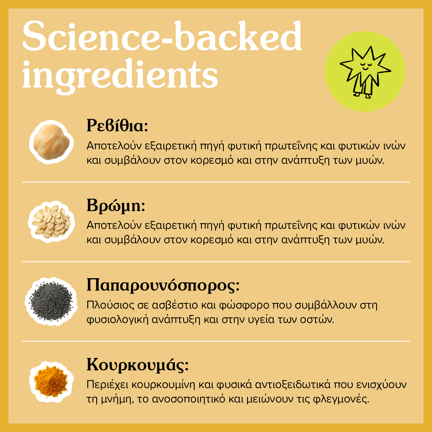 Ρεβίθια (97.1%), βρώμη, αλεύρι σίτου ολικής άλεσης, νερό, έξτρα παρθένο ελαιόλαδο (12.2%), παπαρουνόσπορος, φρέσκος χυμός λεμόνι, κουρκουμάς, αποξηραμένος δυόσμος, σκόρδο σκόνη.