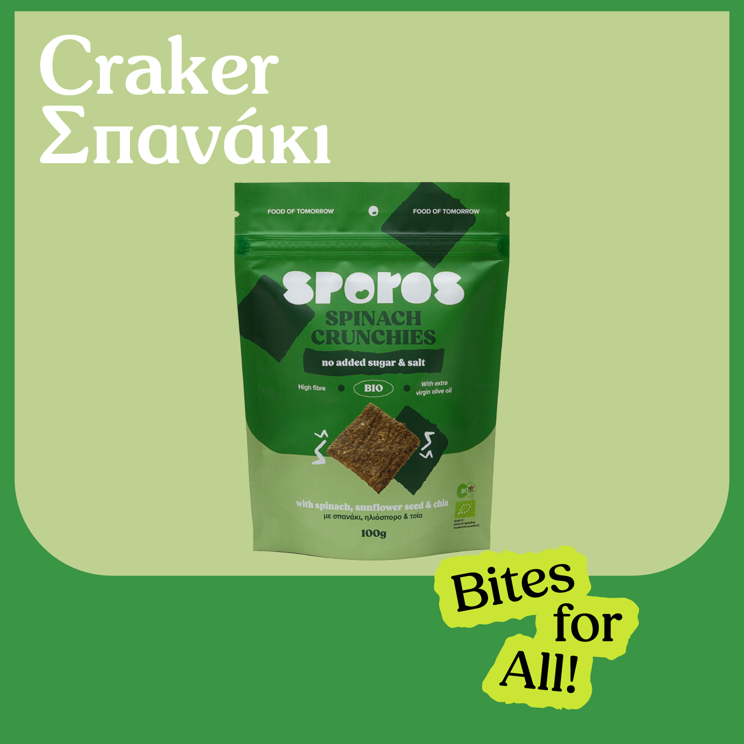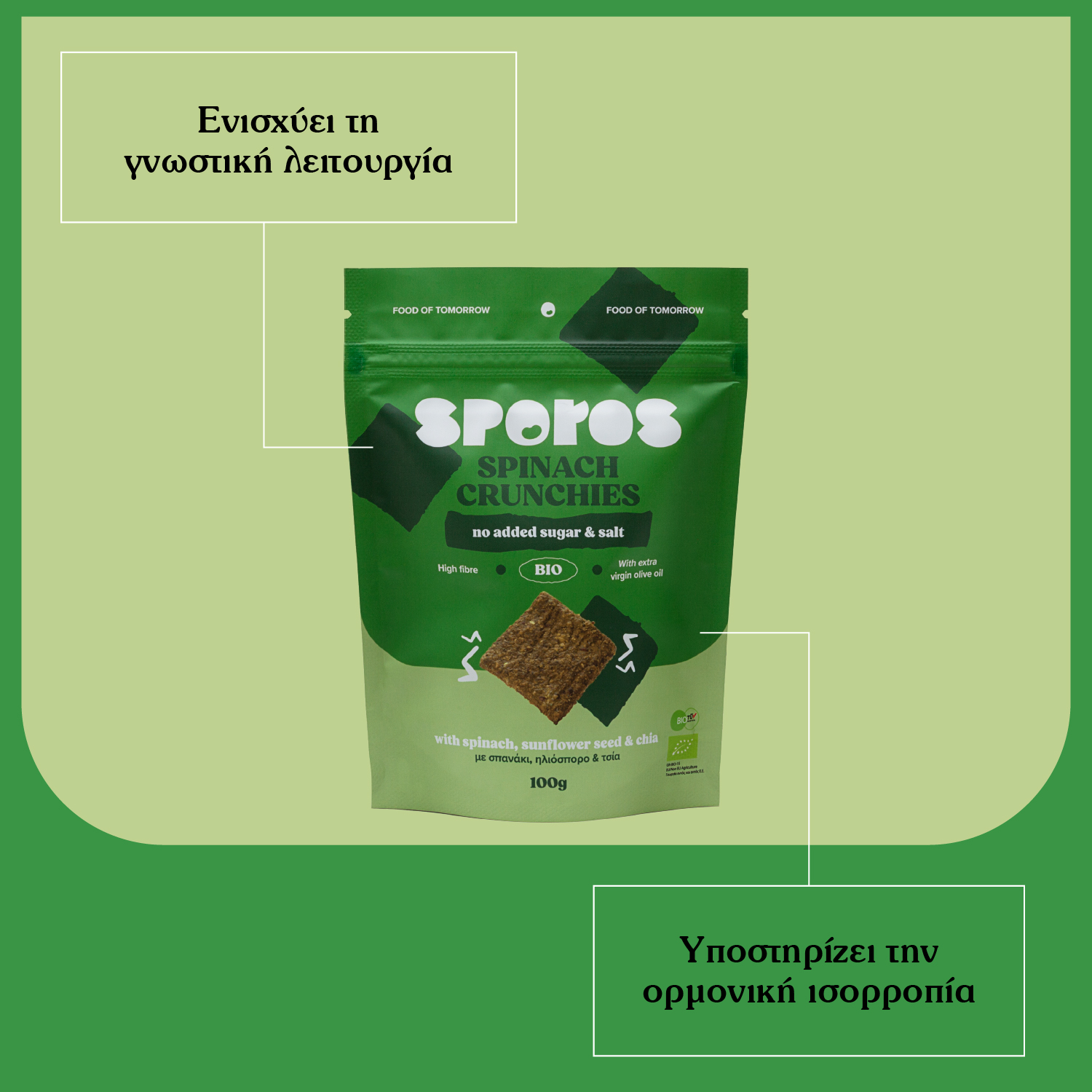 ? H πλούσια σε θρεπτικά συστατικά και φυτικές ίνες βρώμη, συνδυάζεται με το σπανάκι και με μια μεγάλη ποικιλία σπόρων, για να μας δώσει ένα γευστικό και υγιεινό κράκερ. Γεμάτο με βιταμίνη Ε, γνωστή για τις αντιοξειδωτικές ιδιότητές της, ενισχύει το ανοσοποιητικό συστήμα, ενώ προστατεύει τον οργανισμό. Περιέχει επίσης βιταμίνη Κ, το σύμπλεγμα των βιταμινών B, φώσφορο, σίδηρο και μαγνήσιο. Ο Sporos έχει δημιουργήσει αυτό το σνακ, όπως και όλα, με την καθοδήγηση της επιστημονικής του ομάδας!