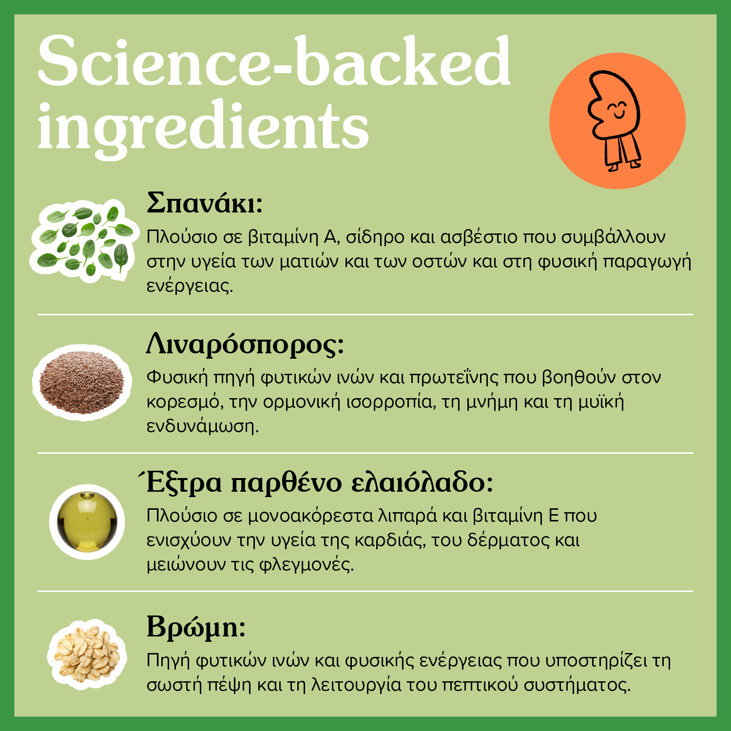 Βρώμη (59.5%), σπανάκι (39.7%), έξτρα παρθένο ελαιόλαδο (15.1%), ηλιόσπορος, σπόρος τσία, λιναρόσπορος (4.7%), παπαρουνόσπορος, μηλόξιδο, αποξηραμένη ρίγανη (0.4%).